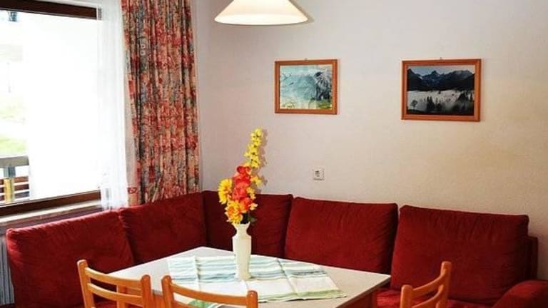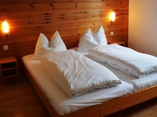 Zweizimmerwohnung für 2 bis 6 Personen Gemütlicher Wohn-Schlafraum (Schlafcouch ausziehbar für 2 Personen) Schlafzimmer mit Doppelbett und einem Stockbett Kochnische mit •2 Elektroherdplatten •Chromstahlspüle •Kaffeemaschine •Koch- und Essgeschirr •Kühlschrank Dusche mit WC Telefon und Sat - TV Bettwäsche (Wechsel wöchentlich, bei längerem Aufenthalt alle 2 Wochen) Hand- und Badetücher (Wechsel wöchentlich) Alle Wohnungen mit Balkon. Die meisten Wohnungen haben einen Südbalkon mit Sitzmöbeln. Abstellraum für Schi- und sonstige Sportgeräte finden Sie im Haus, sowie eine Liegewiese vor dem Haus.