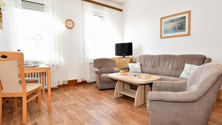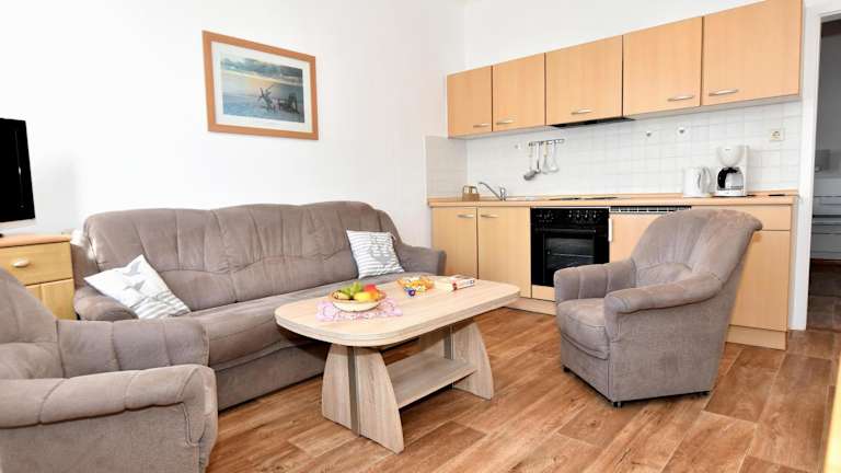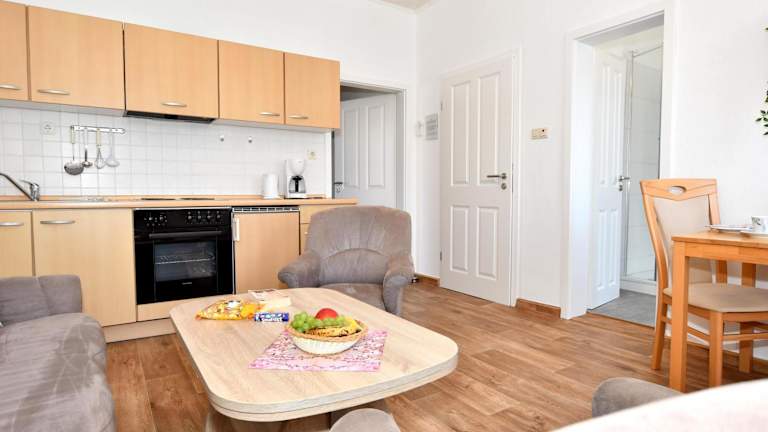 Die Ferienwohnung verfügt über ein Schlafzimmer, eine komplett ausgestattete Küche mit Kühlschrank und Ofen sowie ein Badezimmer mit Dusche. Zur Ausstattung gehören weiterhin ein TV mit Satellitenkanälen sowie Handtücher und Bettwäsche. Die Unterkunft ist Nichtraucherbereich.