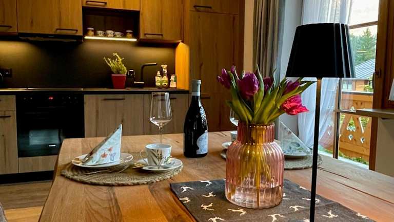 Die Ferienwohnung verfügt über ein Schlafzimmer, ein Badezimmer, eine voll ausgestattete Küche, einen Essbereich und ein Wohnzimmer mit einem Flachbild-TV, Kabelkanälen sowie einen Balkon mit Blick auf die Berge. Bettwäsche und Handtücher sind ebenfalls verfügbar.