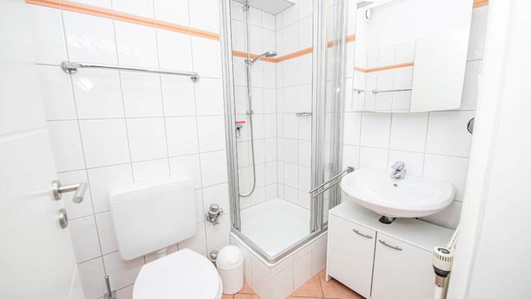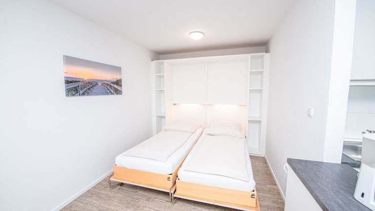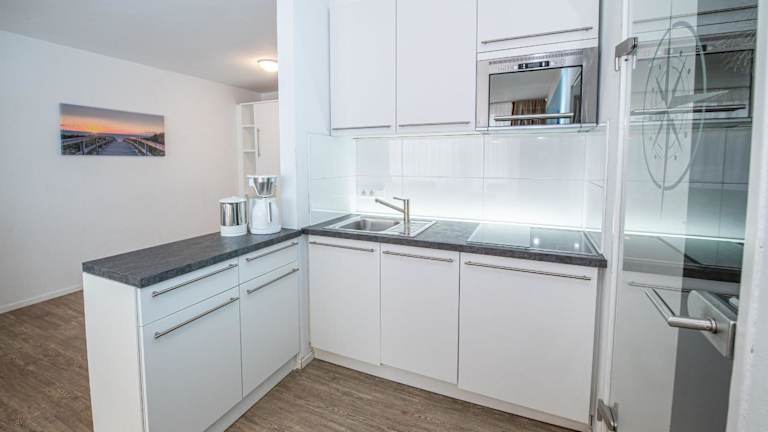 Die Ferienwohnung besteht aus einem Schlafzimmer, einem Wohnzimmer, einer voll ausgestatteten Küche mit Kühlschrank und Kaffeemaschine sowie einem Badezimmer mit Dusche und Haartrockner. Handtücher und Bettwäsche werden bereitgestellt.