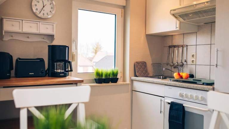 Die Küchenzeile der Ferienwohnung ist ausgestattet mit einem Kühlschrank, einer Herdplatte, einem Toaster und einer Kaffeemaschine, was eine selbständige Verpflegung ermöglicht.