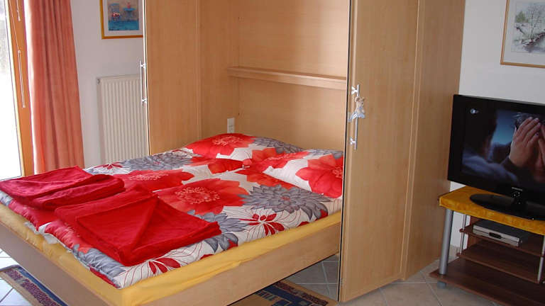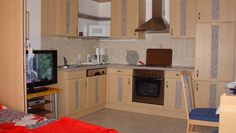 Die Ferienwohnung befindet sich im Erdgeschoss und umfasst 1 Schlafzimmer. Zur Ausstattung gehören ein Flachbild-TV mit Satellitenkanälen und eine voll ausgestattete Küche. Diese ist mit einem Kühlschrank, einem Geschirrspüler, einer Waschmaschine, einem Ofen sowie einer Mikrowelle ausgestattet. Handtücher und Bettwäsche werden zur Verfügung gestellt.