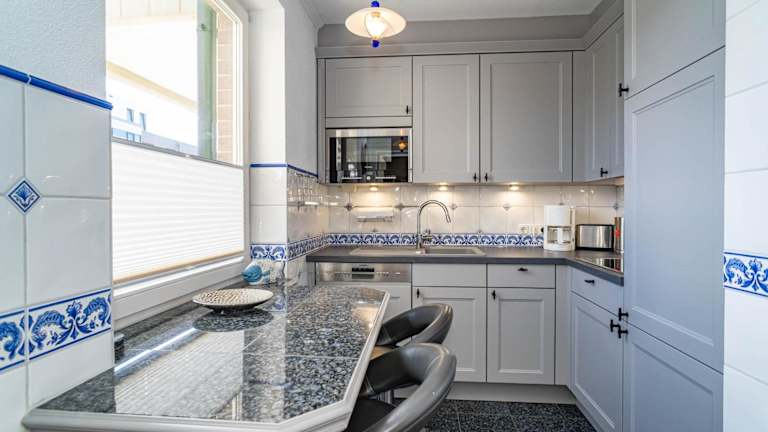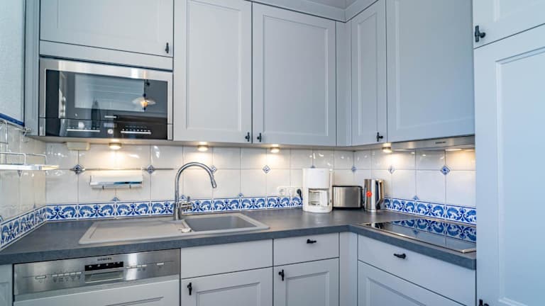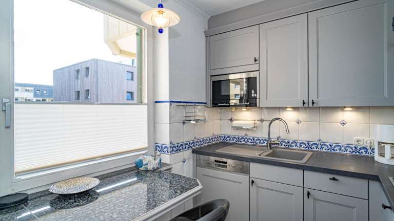 Die Ferienwohnung verfügt über eine voll ausgestattete Küche mit Kühlschrank, Geschirrspüler, Waschmaschine, Mikrowelle und Herdplatte, ideal für die Selbstverpflegung.