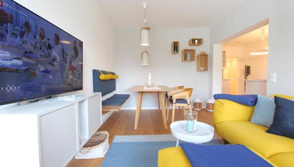 Die Ferienwohnung umfasst 2 Schlafzimmer und ist mit einem Flachbild-TV sowie einer gut ausgestatteten Küche mit Kühlschrank und Geschirrspüler versehen. Zudem gibt es 1 Badezimmer mit einer Dusche. Gartenmöbel sind ebenfalls vorhanden.