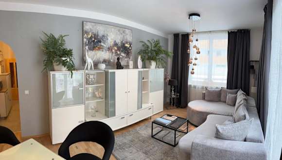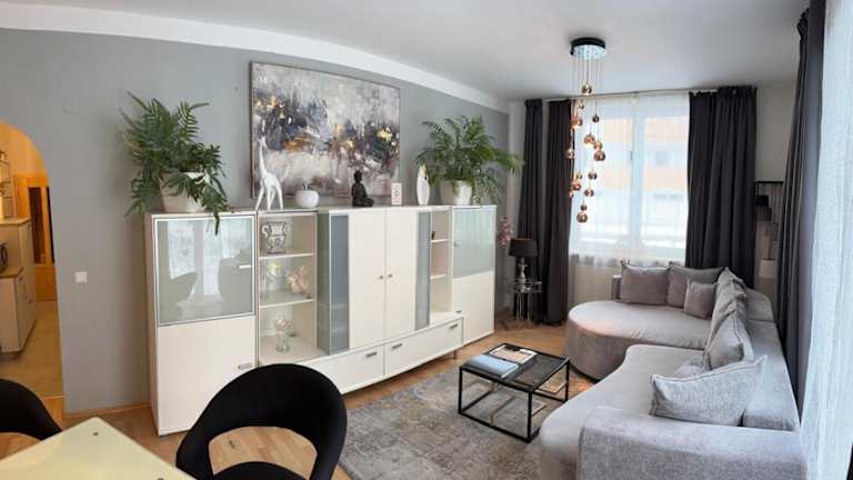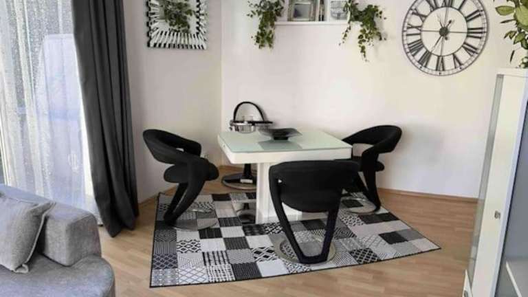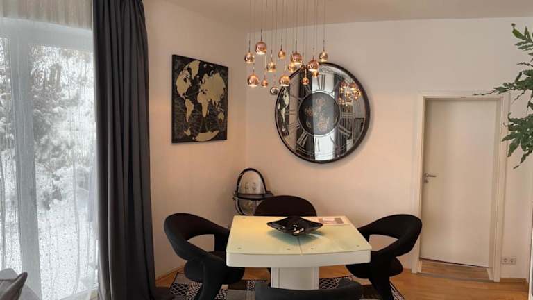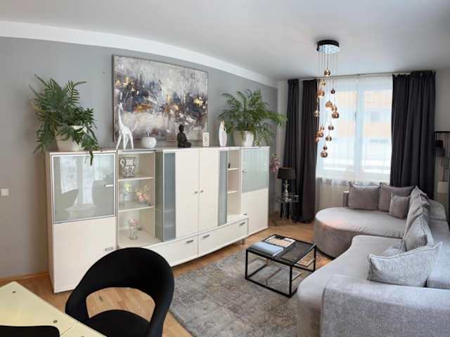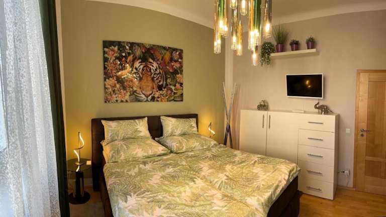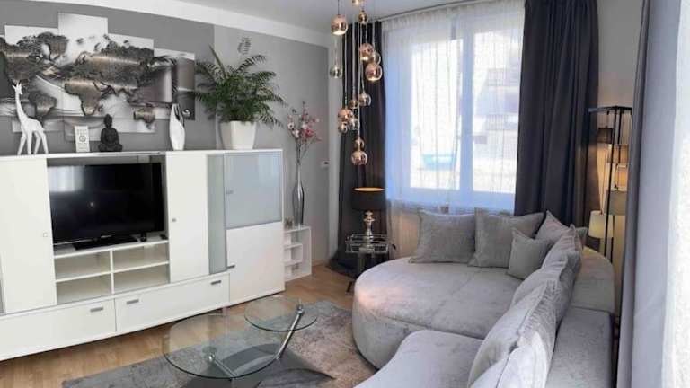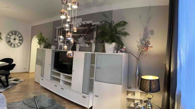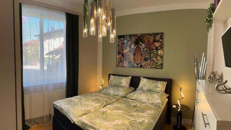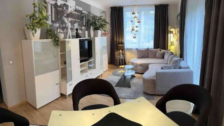 Die Wohnung umfasst 2 Schlafzimmer, ein Wohnzimmer, eine gut ausgestattete Küche mit Kühlschrank und Geschirrspüler sowie ein Badezimmer mit Dusche. Weiterhin sind ein Flachbild-TV, Handtücher und Bettwäsche verfügbar. Gäste haben Zugang zu einer Terrasse mit Gartenblick.