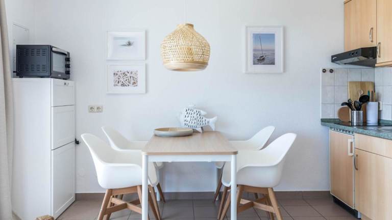Die Ferienwohnung bietet eine eigene Küche, ausgestattet mit Kühlschrank und Mikrowelle, zur Selbstverpflegung. Es sind keine spezifischen Informationen zu weiteren Verpflegungsoptionen vorhanden.