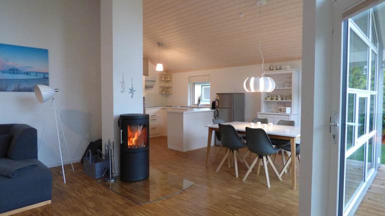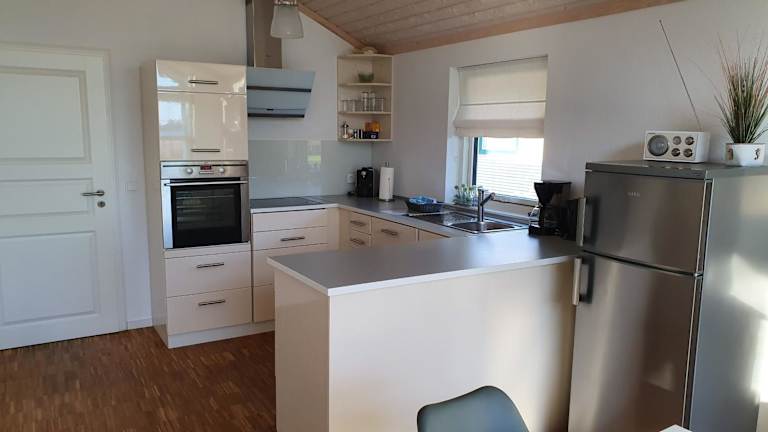 Das Ferienhaus bietet ein Wohnzimmer mit einem Essbereich, zwei Schlafzimmer und ein Badezimmer mit einer Dusche. Die Küche ist mit einem Kühlschrank, einem Geschirrspüler und einem Ofen ausgestattet. Zur Ausstattung gehören zudem ein Blu-ray-Player, ein Flachbild-TV mit Satellitenkanälen und ein DVD-Player.
