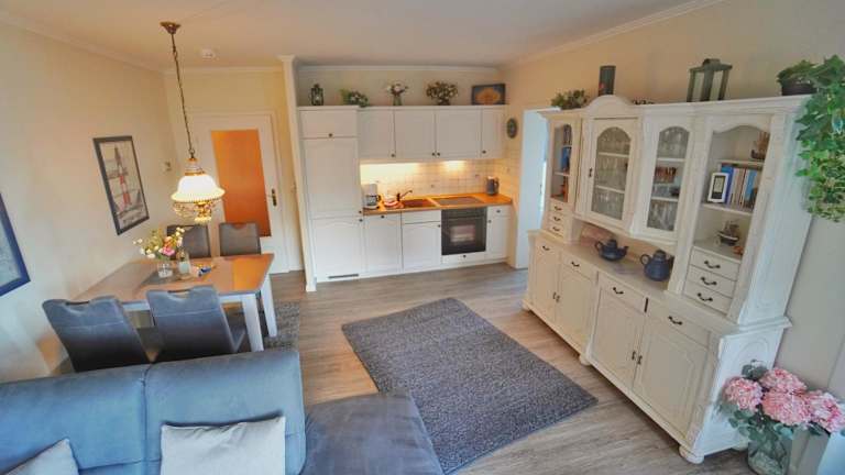 Die Ferienwohnung verfügt über eine Küchenzeile, die mit einem Kühlschrank, einem Geschirrspüler, einem Ofen, einer Kaffeemaschine und einem Wasserkocher ausgestattet ist.