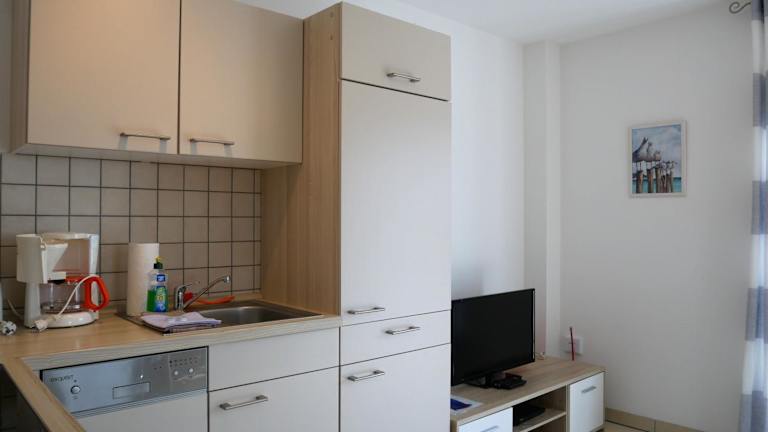 Die Unterkunft bietet eine voll ausgestattete Küchenzeile, einer Mikrowelle, einem Kühlschrank, einem Geschirrspüler sowie weiteren Küchengeräten wie einer Kaffeemaschine und einem Wasserkocher, was die Selbstversorgung ermöglicht.