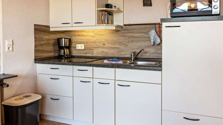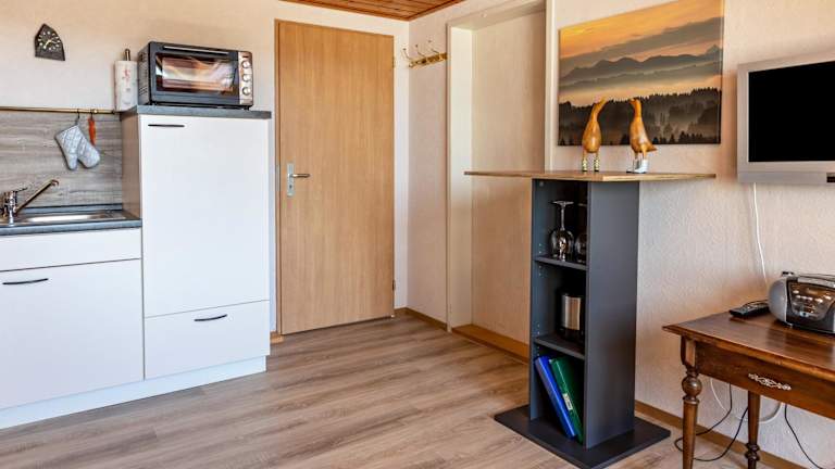 Die Ferienwohnung verfügt über eine eigene Küche, die mit einem Kühlschrank und einem Ofen ausgestattet ist, sodass Selbstverpflegung möglich ist.