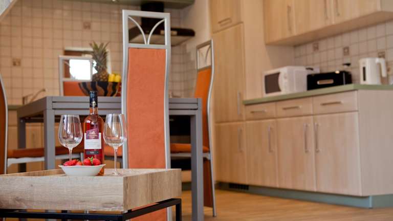 Die Wohnung umfasst zwei Schlafzimmer, ein Badezimmer sowie einen Essbereich und eine voll ausgestattete Küche. Es sind auch Bettwäsche und Handtücher vorhanden. Ein Balkon mit Blick auf die Berge gehört ebenfalls zur Ausstattung, die weiterhin einen Flachbild-TV mit Satellitenkanälen umfasst.