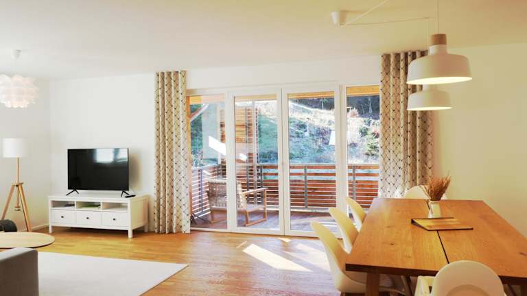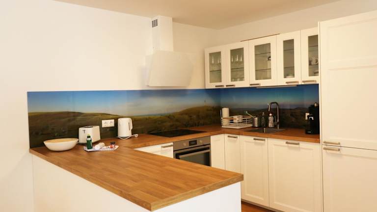 Die Ferienwohnung verfügt über einen Balkon, zwei Schlafzimmer, ein Wohnzimmer sowie eine gut ausgestattete Küche mit Kühlschrank und Geschirrspüler. Handtücher und Bettwäsche werden bereitgestellt.