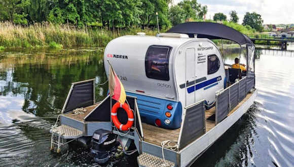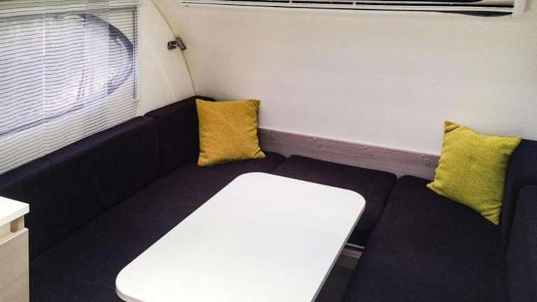 Das Boot umfasst 1 Schlafzimmer, ein Badezimmer mit Dusche, einen Sitzbereich und eine voll ausgestattete Küche mit Kühlschrank.