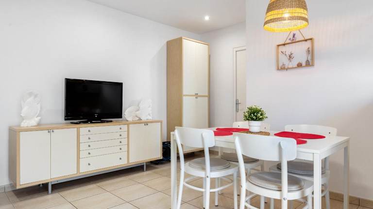 Die Ferienwohnung verfügt über zwei Schlafzimmer, ein Wohnzimmer, ein Badezimmer mit Dusche sowie eine gut ausgestattete Küche mit Kühlschrank und Mikrowelle. Besonders hervorzuheben ist der Balkon mit Meerblick sowie die Terrasse. Zur Ausstattung gehören weiterhin ein Flachbild-TV sowie die Bereitstellung von Handtüchern und Bettwäsche.