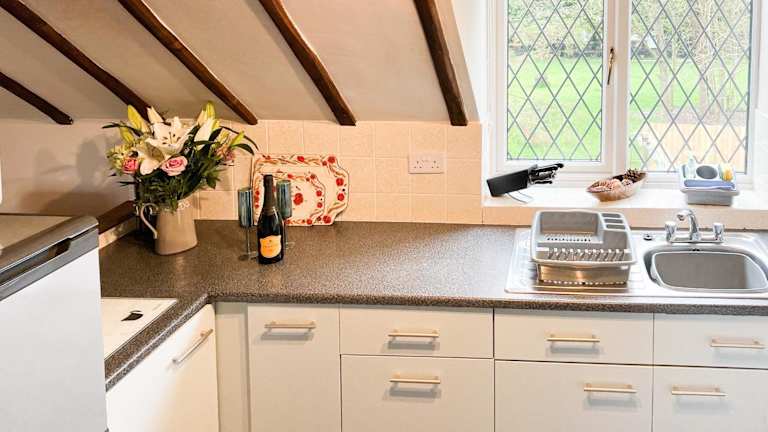 Das Ferienhaus umfasst zwei Schlafzimmer und ein Badezimmer, das mit einer Dusche ausgestattet ist. Eine Küche ist ebenfalls vorhanden.