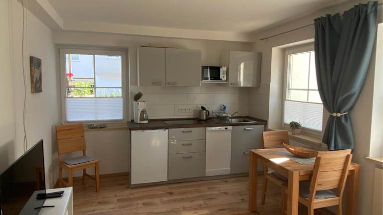 Die Ferienwohnung bietet eine Terrasse und einen Sitzbereich sowie einen TV. Sie verfügt über eine voll ausgestattete Küchenzeile mit Kühlschrank, Geschirrspüler, Mikrowelle, Herdplatte, Toaster, Kaffeemaschine und Wasserkocher. Das eigene Badezimmer ist mit einer Dusche und einem Haartrockner ausgestattet.