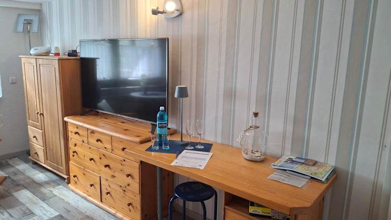 Die Ferienwohnung umfasst ein Schlafzimmer und ist mit einer Küchenzeile ausgestattet, die über einen Kühlschrank und eine Herdplatte verfügt. Des Weiteren gibt es ein Badezimmer mit Dusche und Haartrockner. Handtücher und Bettwäsche werden bereitgestellt. Es handelt sich um eine Nichtraucherunterkunft.