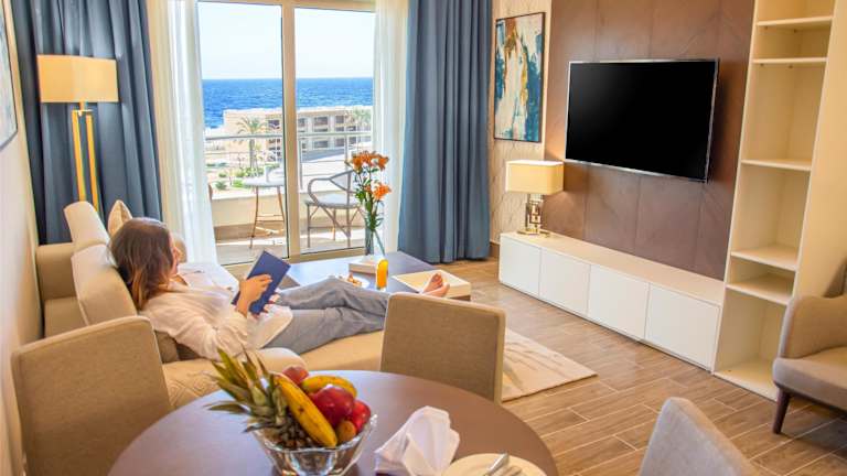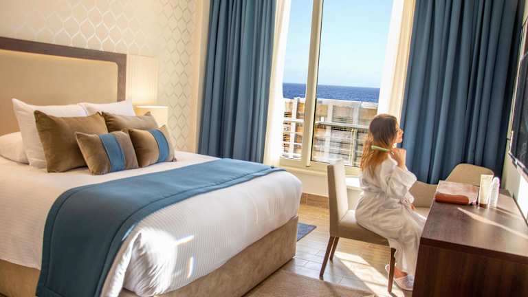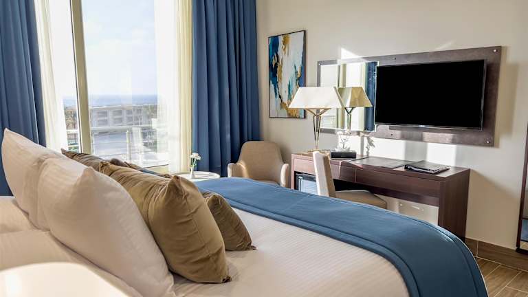 Die klimatisierten Zimmer sind mit einem Balkon oder einer Terrasse ausgestattet, die einen Blick auf den Pool bieten. Zur Ausstattung gehören ein Doppelbett, ein Flachbild-TV, ein Safe, Internetzugang und Telefon. Die Badezimmer sind mit einer Dusche und Badewanne ausgestattet und bieten einen Haartrockner sowie einen Kosmetikspiegel. Bettwäsche und Handtücher sind ebenfalls vorhanden.