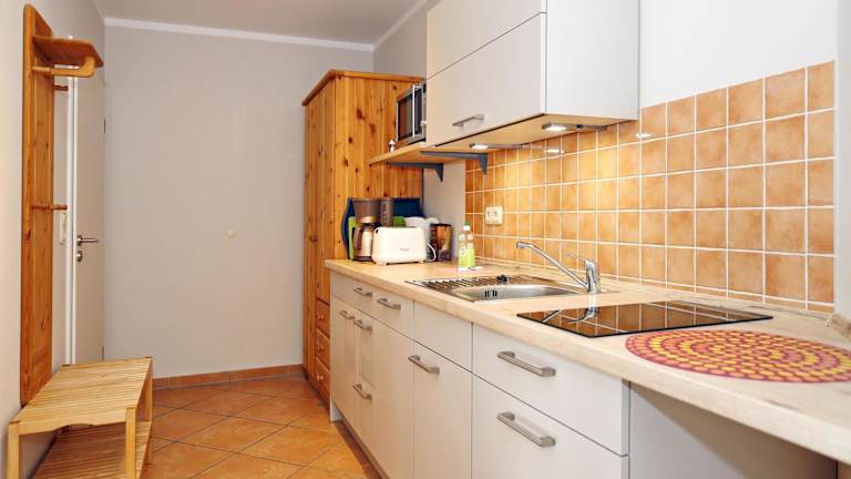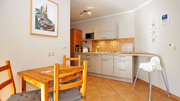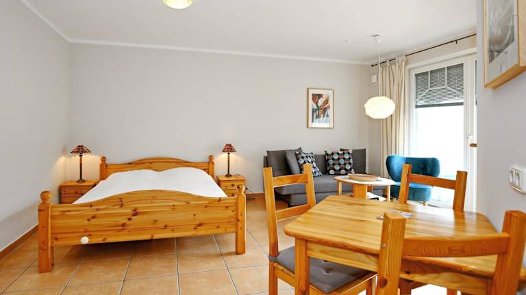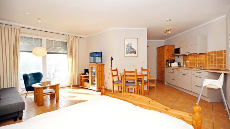 Die Ferienwohnung verfügt über ein Schlafzimmer, ein Badezimmer und eine voll ausgestattete Küche mit Kühlschrank und Geschirrspüler. Zur Ausstattung gehören Satelliten-TV und ein Balkon. Bettwäsche und Handtücher sind nicht im Preis inbegriffen, können jedoch gegen Gebühr ausgeliehen oder selbst mitgebracht werden.