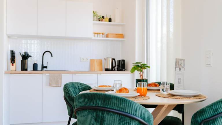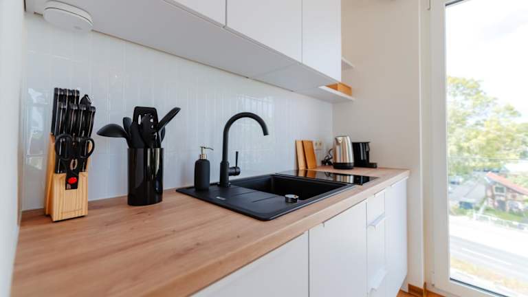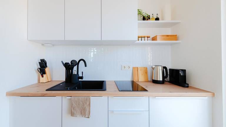 Die Unterkunft verfügt über eine Küchenzeile, die mit einem Kühlschrank, Geschirrspüler, Herdplatte, Toaster, Kaffeemaschine und Wasserkocher ausgestattet ist, wodurch eine Selbstverpflegung möglich ist.