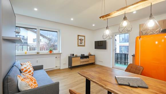 Die Ferienwohnung besteht aus einem Schlafzimmer und einem Badezimmer. Zudem sind Bettwäsche und Handtücher vorhanden. Ein Flachbild-TV, ein Essbereich, eine voll ausgestattete Küche und ein Balkon mit Blick auf die Berge komplettieren die Ausstattung.