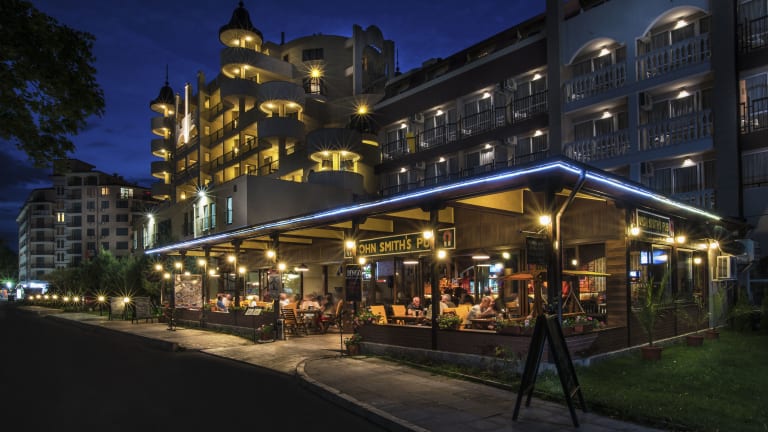Alles inklusive, reichhaltiges Fruehstuecks-, Mittags-, Abendessenbuffet in den Hauptrestaurants "Alexandria" und "Casablanca" mit Show Cooking und Kinderbuffet. Bier, Wein und alkoholfreie Getraenke zu den Mahlzeiten. 1 Mal pro Woche bulgarischer Themenabend und 1 pro Woche mediterränischer Themenabend. Langschlaeferfruehstueck an der Snack Bar- 10:00-12:00 Uhr . A-la carte Restaurant “Grill House- John Smith” bietet internationale Spezialitaeten gegen Aufpreis an. Leckere Eisspezialitaeten an der Fressmeile /im Garten gelegen/. An der Snack Bar werden stundenweise von 12.00 bis 17.00 Uhr diverse Snacks wie Pizza, Sandwiches, Mais, Pfannkuchen, Doener, Kuchen, Eis usw. angeboten. Die Beachbar (11.00-18.00 Uhr) bietet lokale alkoholfreie Getraenke und Bier fuer die Gaeste mit Strandpaket. Lokale Softgetraenke, Bier, eine Auswahl an Coctails und alkoholischen Getraenken (11.00-23.00) an den Lobby Bars des Resorts.
