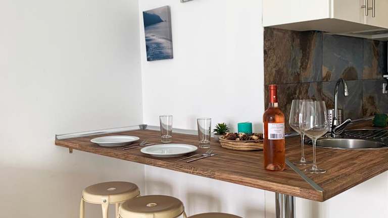 Die Ferienwohnung umfasst ein Schlafzimmer, ein Wohnzimmer und eine voll ausgestattete Küche mit Kühlschrank und Kaffeemaschine. Ein Badezimmer mit Dusche und Haartrockner ist ebenfalls vorhanden. Handtücher und Bettwäsche werden bereitgestellt.