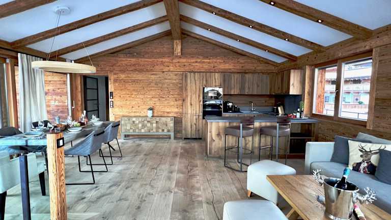 Die Unterkunft verfügt über vier Schlafzimmer und vier Badezimmer. Die Ausstattung umfasst Bettwäsche, Handtücher, einen Flachbild-TV, einen Essbereich sowie eine voll ausgestattete Küche. Eine Terrasse mit Blick auf die Berge ergänzt die Räume und bietet zusätzlichen Komfort für die Gäste.