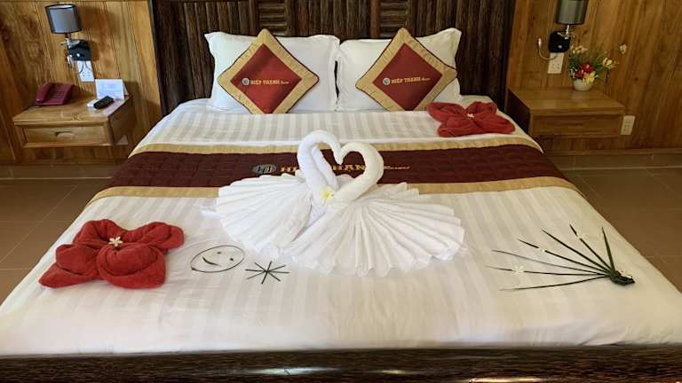 Die Zimmer im Hiep Thanh Resort sind im vietnamesischen Stil gehalten und bieten eine gemütliche und saubere Unterkunft. Zur Ausstattung gehören Klimaanlage, Kabel-TV, eine Sitzecke und ein eigenes Badezimmer mit Warm-/Kaltwasserdusche. Kostenfreies WLAN ist ebenfalls verfügbar.