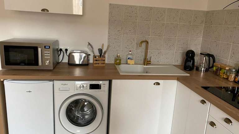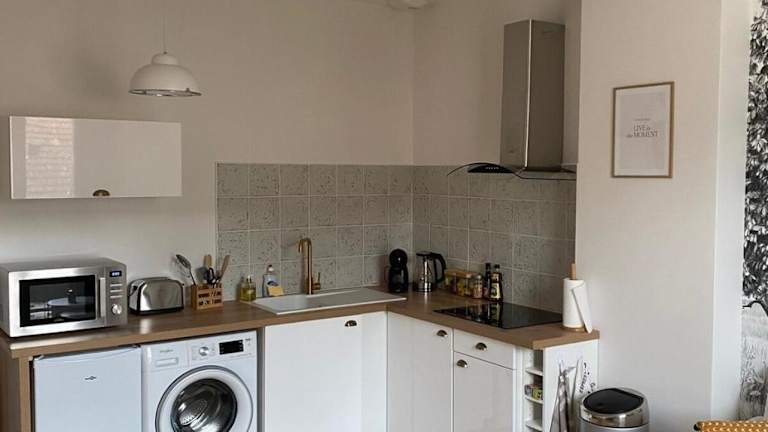 Die Ferienwohnung verfügt über ein Schlafzimmer und bietet Annehmlichkeiten wie einen TV sowie eine voll ausgestattete Küche. In der Küche sind ein Kühlschrank, ein Geschirrspüler, eine Waschmaschine, ein Ofen und eine Mikrowelle vorhanden.