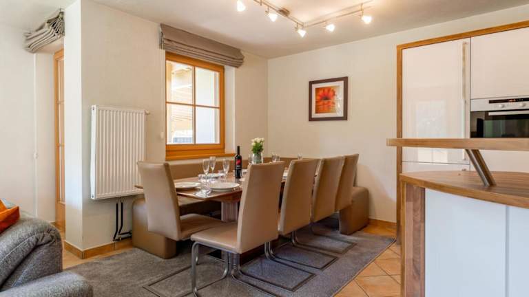 Das Chalet umfasst drei Schlafzimmer, ein Wohnzimmer sowie eine gut ausgestattete Küche mit Kühlschrank und Geschirrspüler. Handtücher und Bettwäsche werden bereitgestellt.