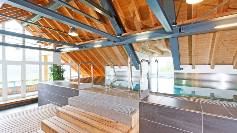 Die Wellness-Attika bietet einen Fitnessbereich mit Ausdauergeräten, zwei Behandlungsräume für Kosmetik und Massagen, finnische Sauna, Sprudelbecken mit Gegenstromanlage