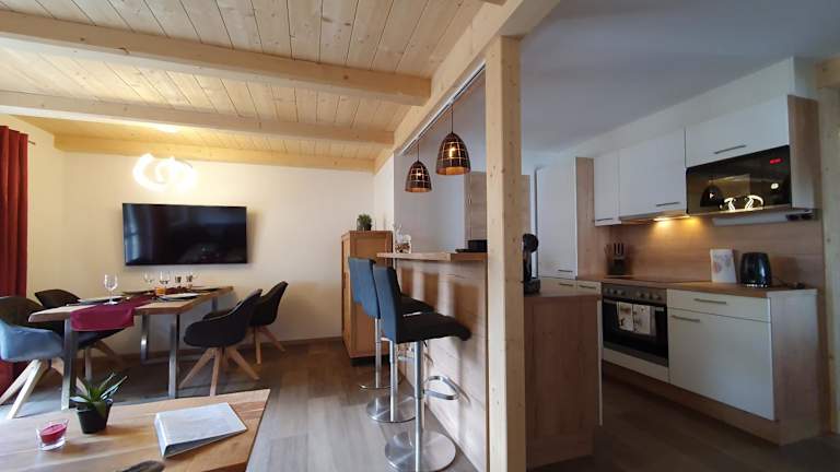 Die Ferienwohnung umfasst zwei Schlafzimmer, ein Wohnzimmer und eine voll ausgestattete Küchenzeile, die mit einem Kühlschrank und einer Kaffeemaschine ausgestattet ist. Ein Badezimmer mit Dusche und Haartrockner ist ebenfalls vorhanden. Handtücher und Bettwäsche werden bereitgestellt. Eine Terrasse gehört ebenfalls zur Ausstattung.