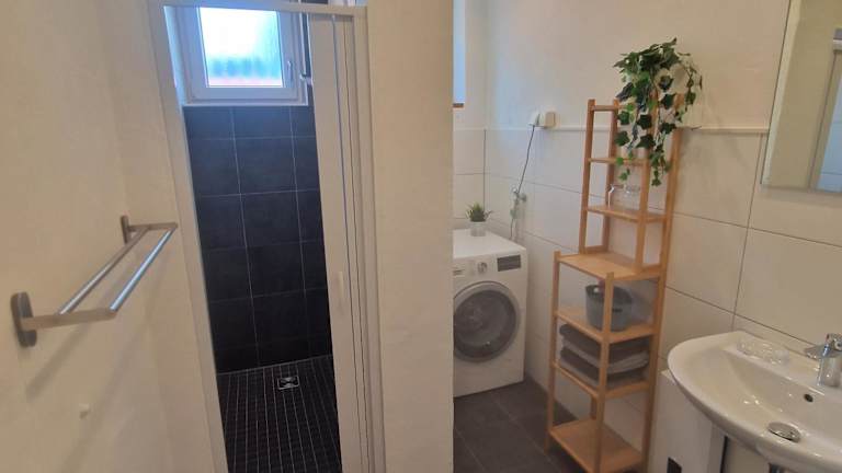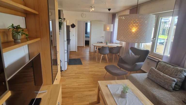 Die Ferienwohnung umfasst ein Schlafzimmer, eine Küchenzeile ausgestattet mit einem Kühlschrank und einem Geschirrspüler, einen Flachbild-TV, einen Sitzbereich sowie ein Badezimmer mit Dusche. Handtücher und Bettwäsche werden bereitgestellt, und eine Terrasse steht ebenfalls zur Verfügung.