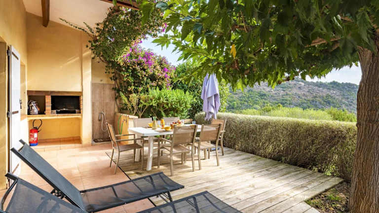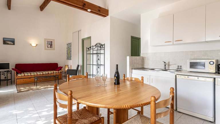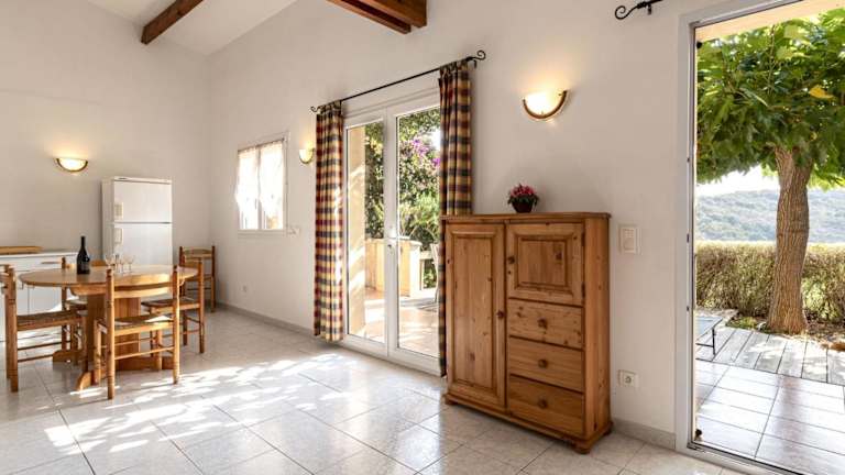 Das Ferienhaus beinhaltet drei separate Schlafzimmer, ein Badezimmer sowie einen Wohnbereich mit einem TV. Eine voll ausgestattete Küchenzeile ist vorhanden, ausgestattet mit einem Kühlschrank und einem Geschirrspüler.