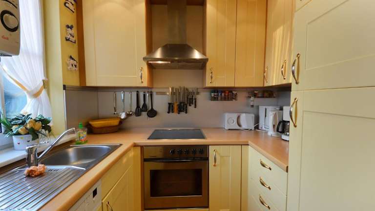 Die gut ausgestattete Küche des Ferienhauses verfügt über einen Kühlschrank und einen Geschirrspüler, was Gästen die Zubereitung eigener Mahlzeiten ermöglicht. Verpflegungsangebote sind keine angegeben.