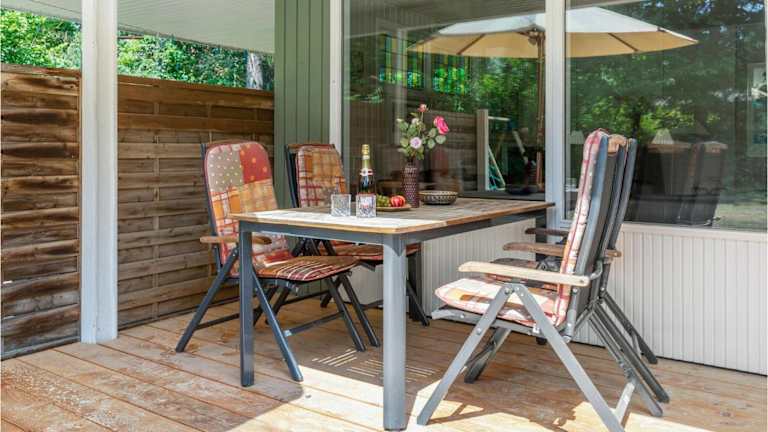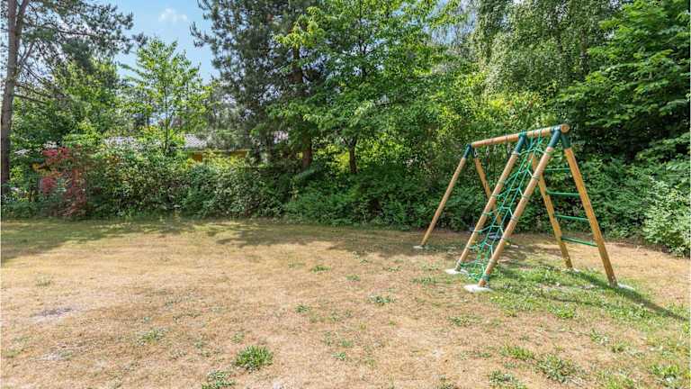 Das Ferienhaus verfügt über drei Schlafzimmer und ein Wohnzimmer. Die Küche ist vollständig eingerichtet und enthält unter anderem einen Kühlschrank und einen Geschirrspüler.