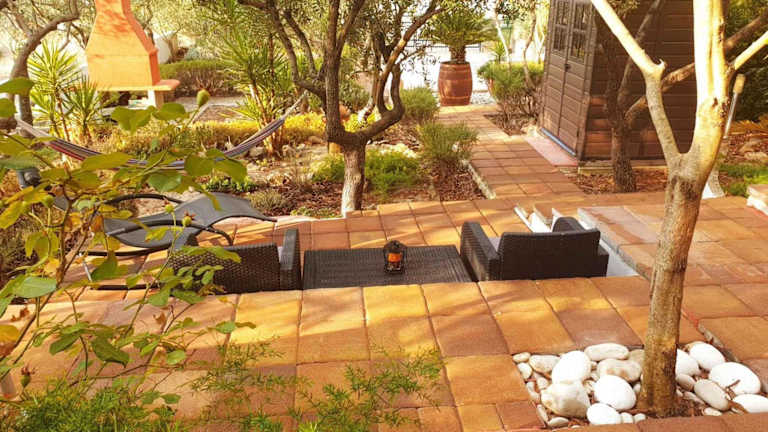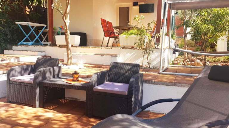 Die Unterkunft bietet 2 Schlafzimmer, ein Badezimmer mit Dusche, Haartrockner und Waschmaschine sowie einen TV mit Satellitenkanälen. Eine Sonnenterrasse und Gartenmöbel sind ebenfalls vorhanden.