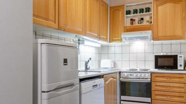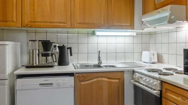 Das Ferienhaus bietet eine komfortable Unterkunft mit einem gemütlichen Wohnbereich und einem TV. Die Küchenzeile ist mit einem Kühlschrank und einem Geschirrspüler ausgestattet, so dass Sie Ihre eigenen Mahlzeiten zubereiten können. Die Einrichtung ist einfach und funktional, um Ihnen einen entspannten Aufenthalt zu ermöglichen.