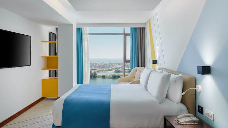 Die Zimmer sind mit Klimaanlage, Heizung und einem Balkon ausgestattet. Die Standardausstattung umfasst ein Kingsizebett, ein Sofabett, einen Safe, eine Minibar und einen Schreibtisch. Zudem stehen ein Kühlschrank, Tee-/Kaffeemaschine, Bügelset und Hosenpresse zur Verfügung. Das Bad verfügt über eine Dusche, Badewanne und Bidet. Hochwertige Annehmlichkeiten wie ein TV-Gerät, Radio, Stereoanlage und WLAN sind ebenfalls vorhanden.