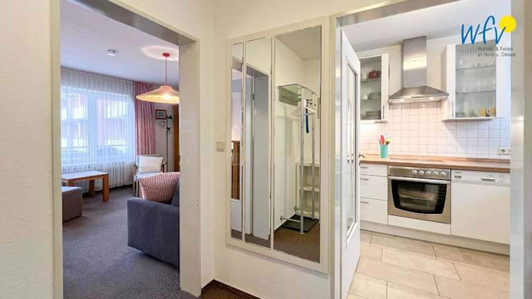 Die Ferienwohnung verfügt über einen Balkon, zwei Schlafzimmer, ein Wohnzimmer sowie eine gut ausgestattete Küche, die mit einem Kühlschrank und einem Geschirrspüler ausgestattet ist.