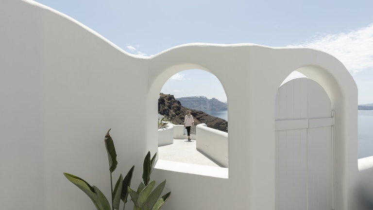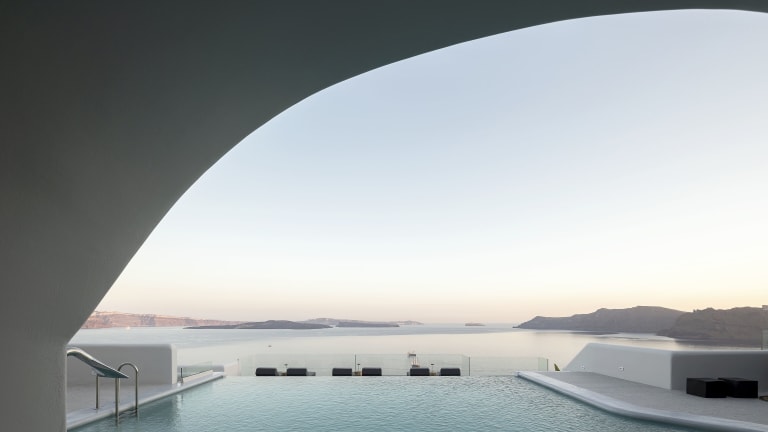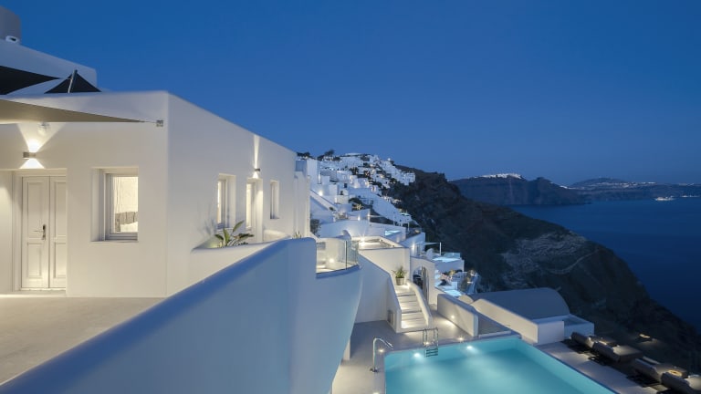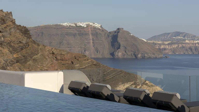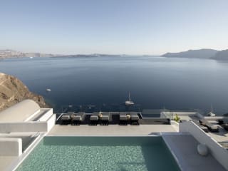 Das Hotel liegt in ruhiger Umgebung auf einer Anhöhe mit Panoramablick auf die Ägäis. Der nächstgelegene Strand befindet sich in ca. 3 km Entfernung. Die malerische Stadt Fira ist etwa 12 km entfernt. Öffentliche Verkehrsmittel stehen in der Nähe zur Verfügung, und Sehenswürdigkeiten wie der Vulkan Nea Kameni sind leicht erreichbar. Entfernungen: Flughafen JTR ca. 17 km, Koloumpos Beach ca. 5 km, Oia Center ca. 350 m.