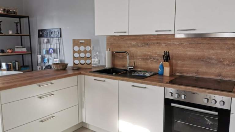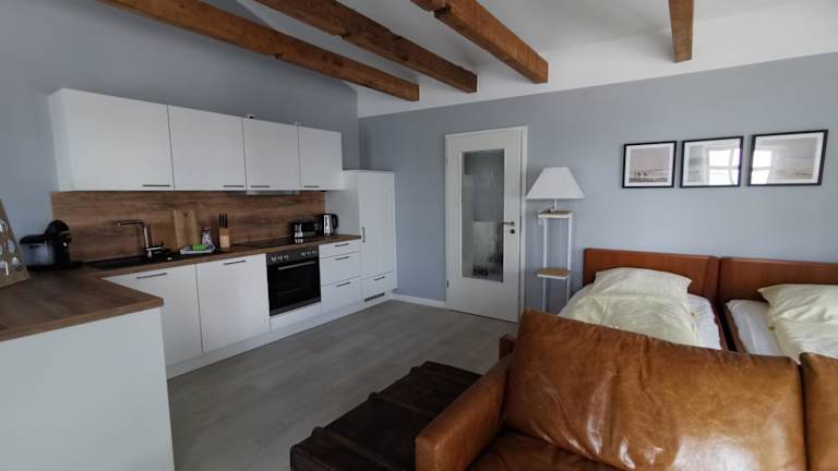 Die Ferienwohnung verfügt über eine gut ausgestattete Küche, die mit einem Kühlschrank, einem Geschirrspüler und einem Ofen ausgestattet ist.