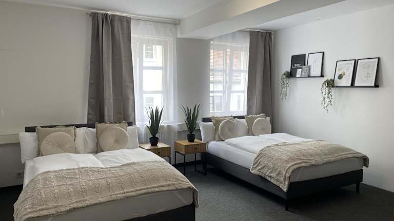Jedes Zimmer in der Unterkunft Hossi-Rathaus ist mit einem Kleiderschrank ausgestattet. Die Zimmer verfügen über ein Gemeinschaftsbad mit Dusche und Haartrockner sowie Stadtblick. Des Weiteren sind die Zimmer mit einem Schreibtisch und einem Flachbild-TV versehen.