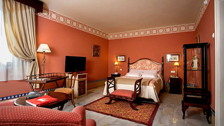 Das Hotel Alcázar de la Reina ist ein wunderschönes Mudéjar-Gebäude mit einem Außenpool. Es befindet sich in Carmona, etwa 20 Autominuten vom Flughafen Sevilla San Pablo entfernt und liegt zwischen den Städten Sevilla und Cordoba. Das historische Gebäude bietet einen herrlichen Blick auf die charmante Landschaft der Vega de Carmona. Das Hotel Alcázar de la Reina bietet geräumige und helle Zimmer mit Klimaanlage und Heizung sowie einem Minibar. WLAN-Zugang ist in den öffentlichen Bereichen und in allen Zimmern kostenlos verfügbar. Die öffentlichen Bereiche sind mit schöner Kunst, Wandgemälden und Klavieren dekoriert. Dazu gehören ein À-la-carte-Restaurant und eine Tapas-Bar. Im Wellnessbereich gibt es eine kostenlose Sauna. Außerdem gibt es schöne Gärten, Innenhöfe und eine Lounge-Bibliothek. Wir haben auch zwei Ladestationen für Elektrofahrzeuge.