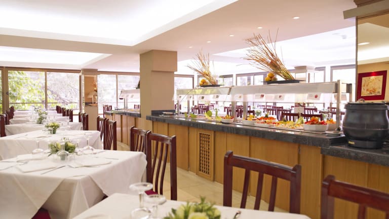 Frühstücksbüffet: Frische Früchte, Joghurt und Milchprodukte, Trockenfrüchte, Müslis, Käse und Wurst, frisch gebackenes Brot und Brötchen, sowie eine Auswahl an Diätprodukten. Und natürlich immer dabei: Brot mit Tomate. Restaurant: Zum Mittag- und Abendessen erwartet unsere Gäste ein abwechslungsreiches Büfett mit internationalen Spezialitäten. Einmal in der Woche werden typisch mallorquinische Spezialitäten serviert. Mittag- und Abendessen - Klimaanlage