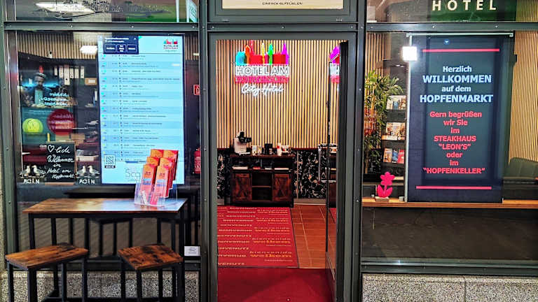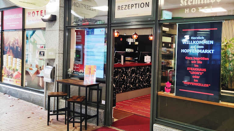 Gastronomisch verwöhnen wir Sie in unseren Restaurants "Leon's" und "Hopfenkeller", die sich idyllisch in den Innenhof des historischen Hopfenmarktes einfügen.