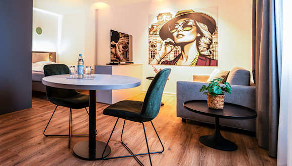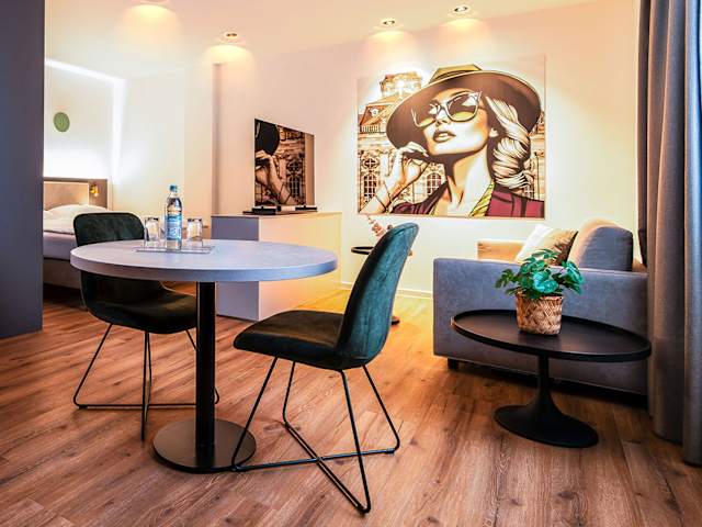 Bei unseren 110 Zimmern, davon 2 Junior Suiten, 17 Superior Zimmer sowie 5 Apartments, findet sich für jeden Gast das Richtige. Auf sieben Themenetagen hat jedes Zimmer eine individuelle und kunstvolle Gestaltung: Alle speziell von uns für Sie kreiert – unter Mithilfe von regionalen Künstlern wie Gabi Lackenmacher oder Bernd Kissel. Suchen Sie sich einfach das für Sie passende aus! Alle Zimmer haben selbstverständlich eine moderne Ausstattung: 50 Zoll Smart TV, kostenfreies High Speed W-LAN im Glasfasernetz mit 300Mbit/s symmetrisch, Safe oder komfortable Boxspringbetten gehören in jedem Zimmer zur Grundeinrichtung.