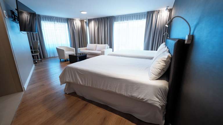 Die Zimmer sind klimatisiert und beinhalten Annehmlichkeiten wie einen Safe, eine Minibar, einen Schreibtisch sowie ein TV-Gerät mit Kabelanschluss. Die Badezimmer verfügen über eine Badewanne und/oder Dusche, Bidet und Haartrockner. Die Zimmer können sowohl als Einzel-, Doppel- oder Raucherzimmer gebucht werden.