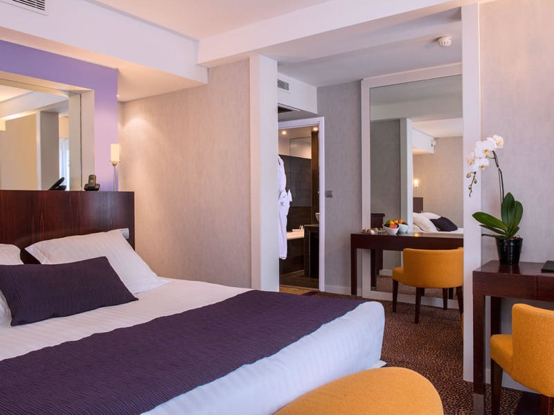 Die Zimmer im Ampère Hotel sind modern und komfortabel gestaltet und bieten den Gästen alles, was sie für einen angenehmen Aufenthalt benötigen. Jedes Zimmer ist klimatisiert und schallisoliert und verfügt über große Doppelglasfenster, die für Ruhe und Entspannung sorgen. Ein Flachbild-Sat-TV und kostenfreies Highspeed-WLAN stehen ebenfalls zur Verfügung. Das eigene Bad ist mit einem Bademantel und Hausschuhen ausgestattet.